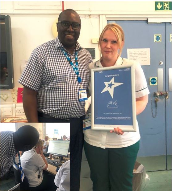 Here's occupational therapist Gilly King receiving her Star Award - and inset is the moment our CEO sprung the surprise on her.
