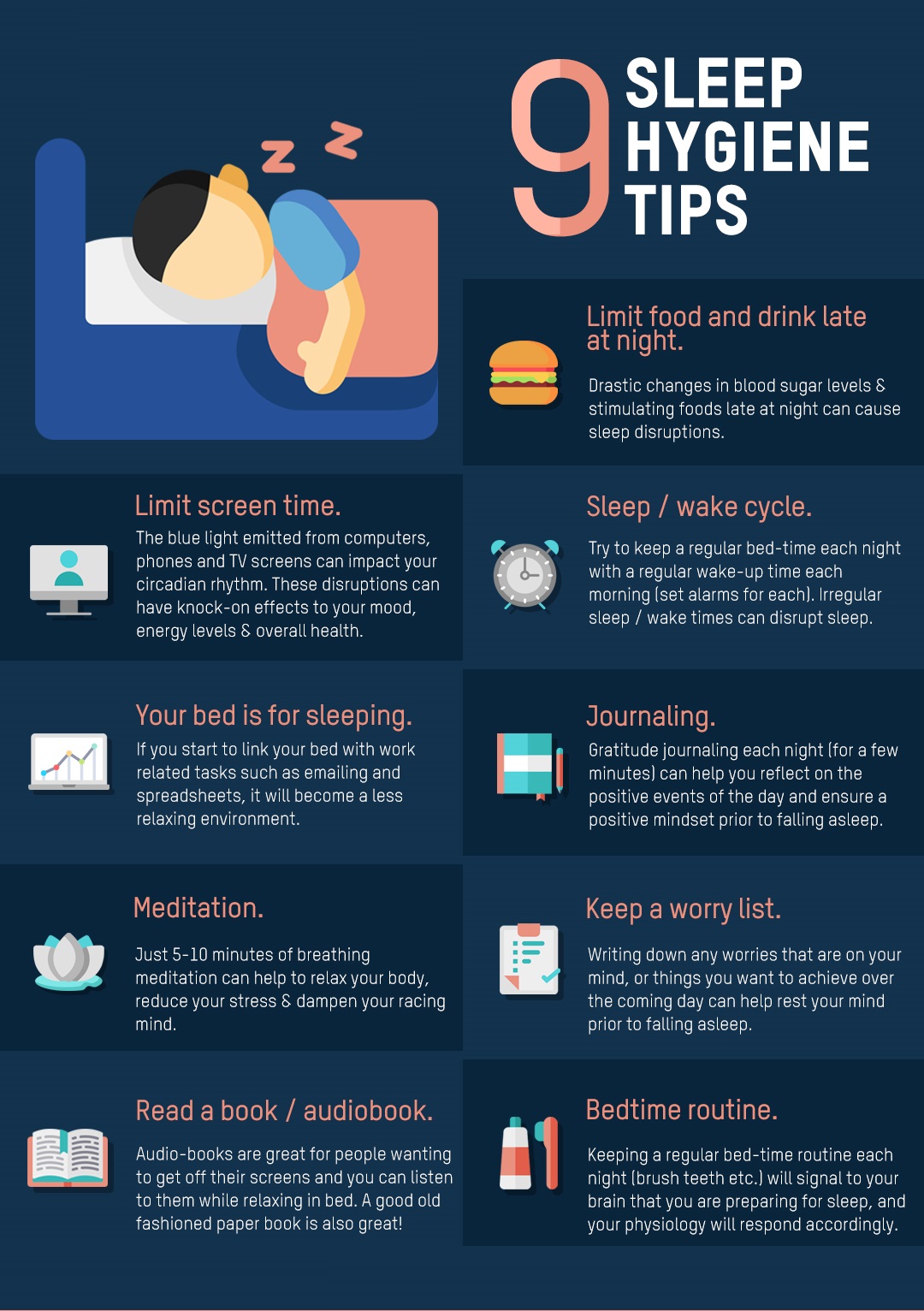 Sleep hygiene: Good sleep behaviour, such as following a bedtime routine, adhering to a consistent sleep schedule, keeping the bedroom cool and dark, and avoiding heavy meals, stimulating caffeine, or alcohol at night.
